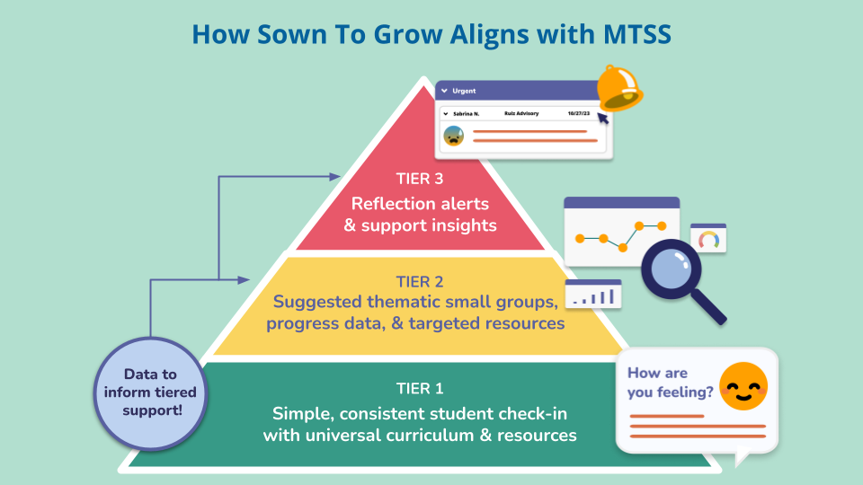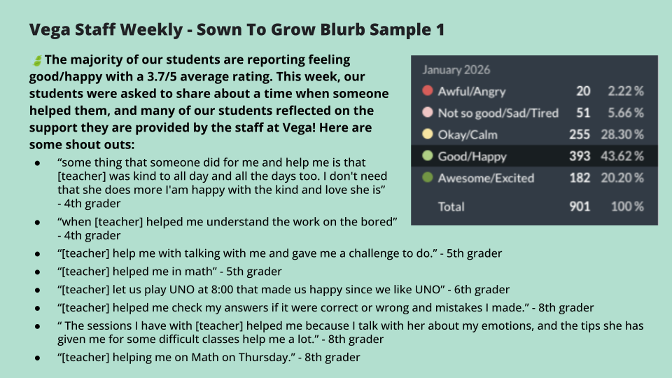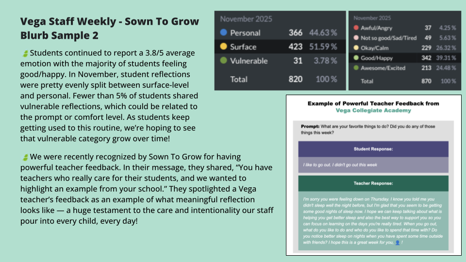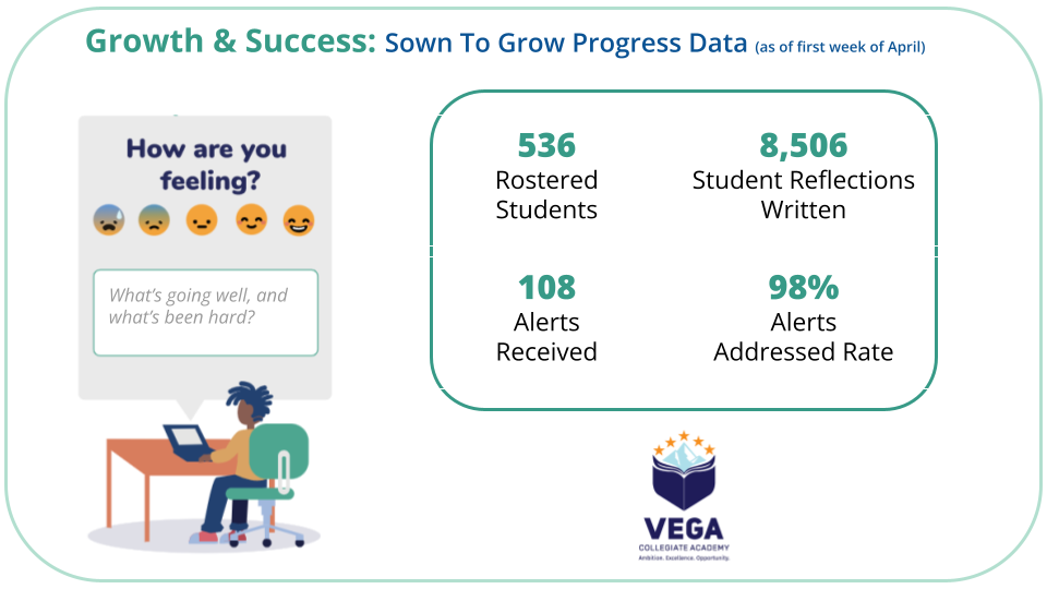 Furthermore, Vega weaves Sown To Grow into their well-being framework by using the platform as another data point to identify students needing added support who may otherwise go under the radar. Beyond teacher referrals, survey details, or support calls, this extra, proactive step prevents students from slipping through the cracks.