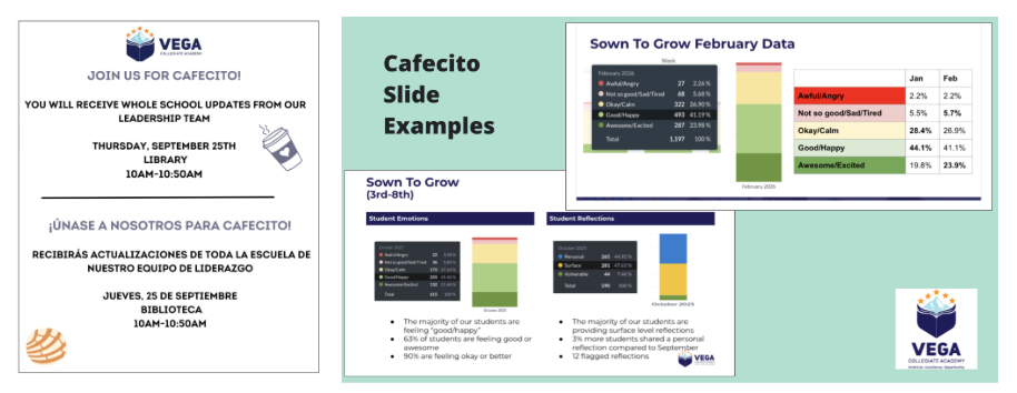 For example, Sown To Grow insights are one of the agenda items incorporated into Cafecito, a monthly in-person event that unites school leaders and families for Vega updates, coffee, and conversation.