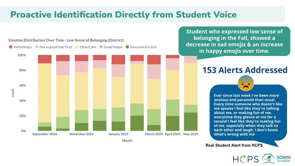 In this simple, five-minute routine, students respond to brief prompts about how they're feeling and what's been hard, and that data flows in real time to educators and support staff who can see patterns across classrooms, grade levels, and the district. This creates early visibility into needs that might otherwise stay hidden until they become crises—HCPS addressed 153 student alerts in a single year through this approach.