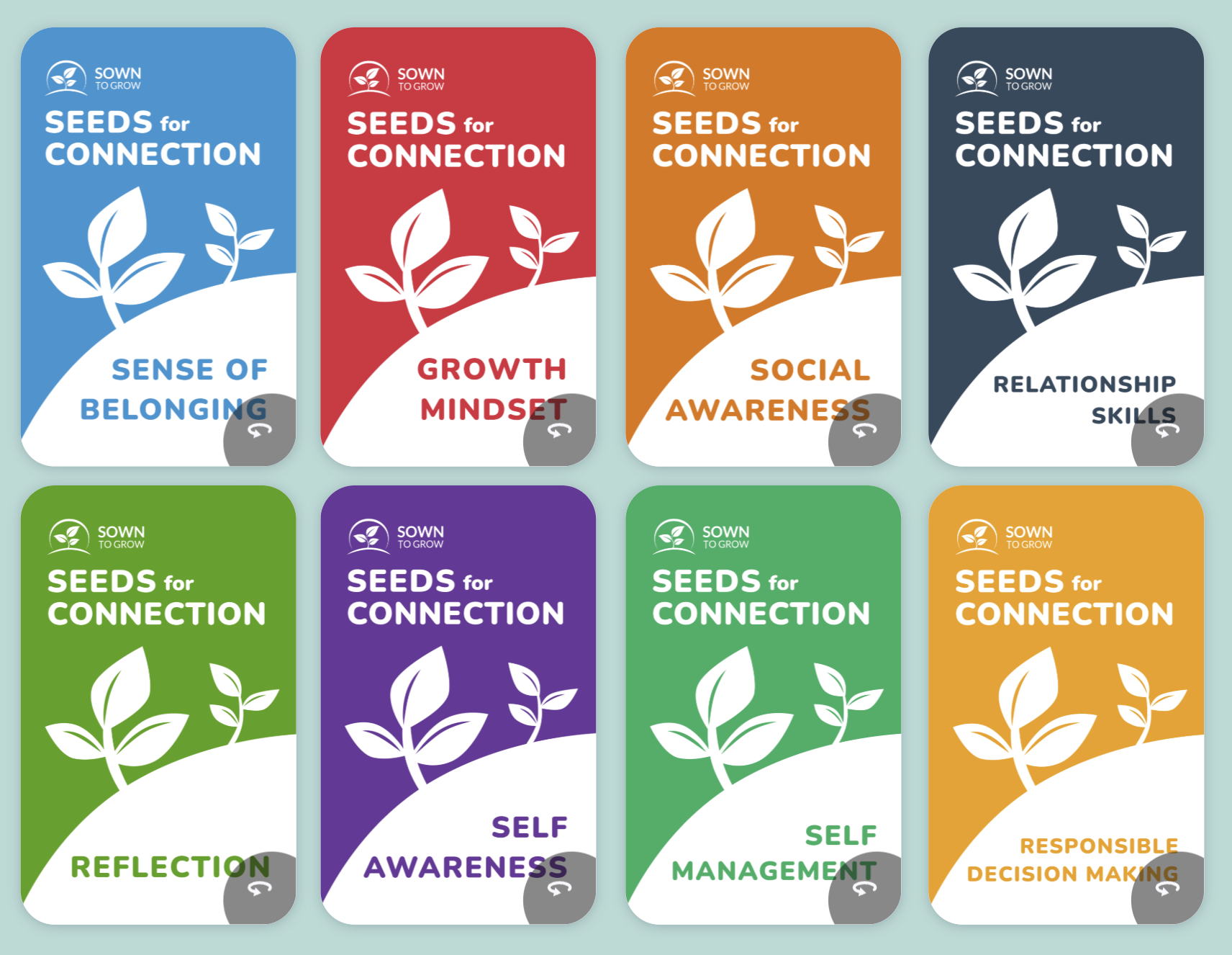 This organizational belief also inspired the creation of Sown To Grow's Seeds For Connection cards, a CASEL compentency-aligned deck containing 52 reflection prompts for adults—perfect for PDs, PLCs, and more.