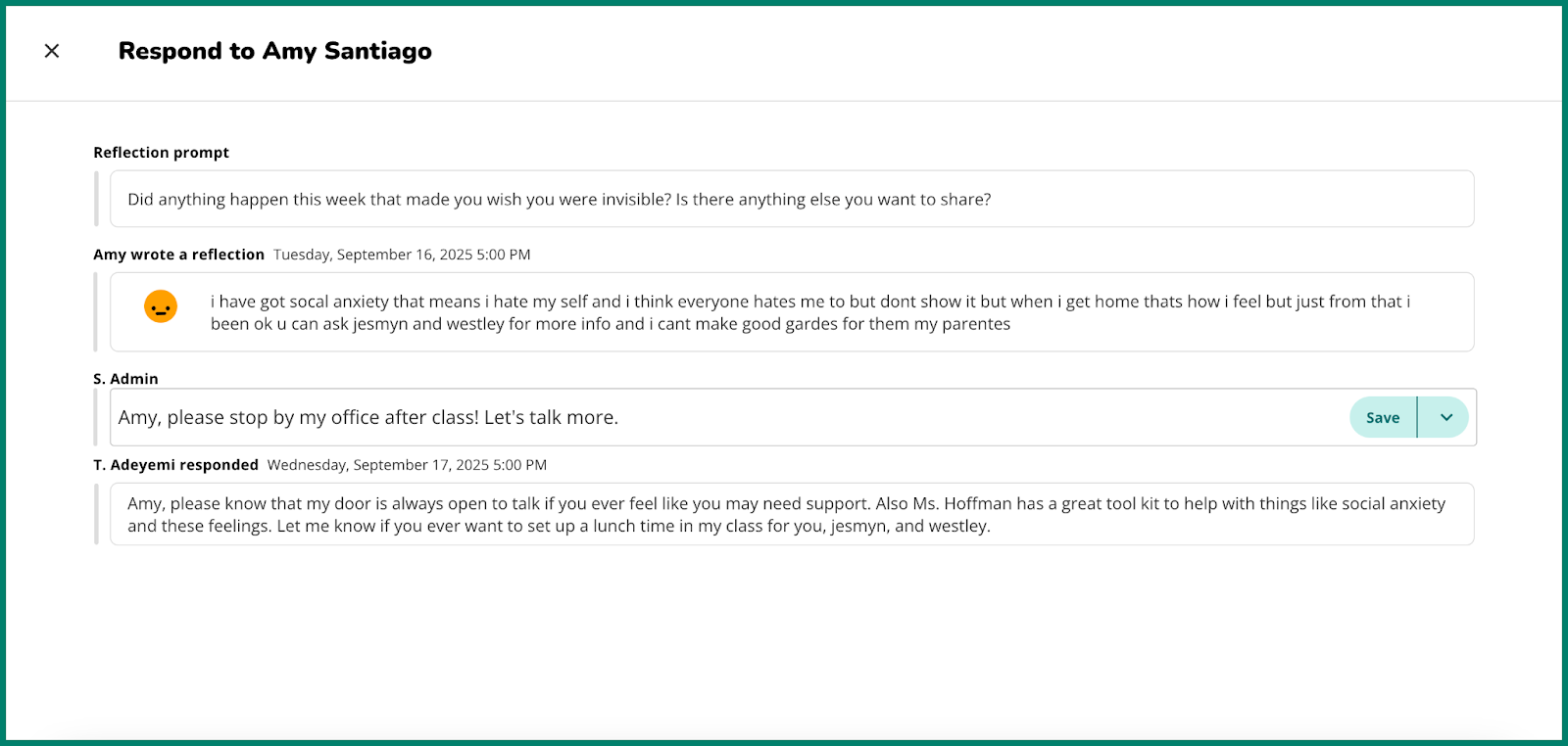 Administrators can respond to alerted student reflections, even after a teacher has already responded. While we advise educators and administrators to be mindful of the appropriate response(s) to a student, multiple administrators are able to respond to a reflection in addition to the student's teacher.