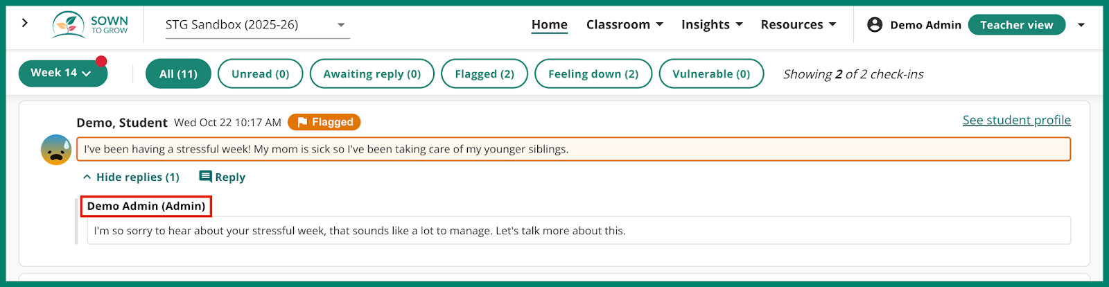 Students can read admin responses the next time they log in to Sown To Grow. In the student view, there is no distinction between teacher and admin responses.