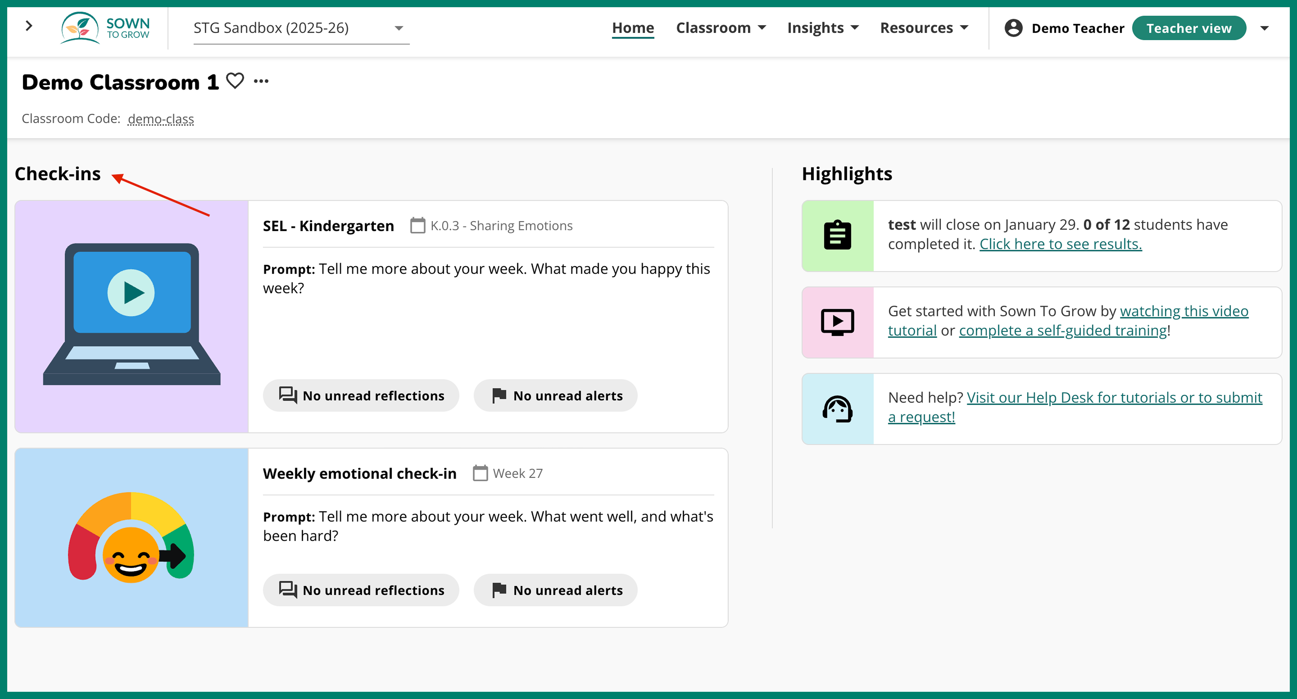 Teachers can now see a comprehensive list of ALL student reflections in their class that have not yet received a teacher response, regardless of the module type or the reflection date. Teachers can access this list by clicking "Insights" in the top level navigation, and then clicking "Classroom".
