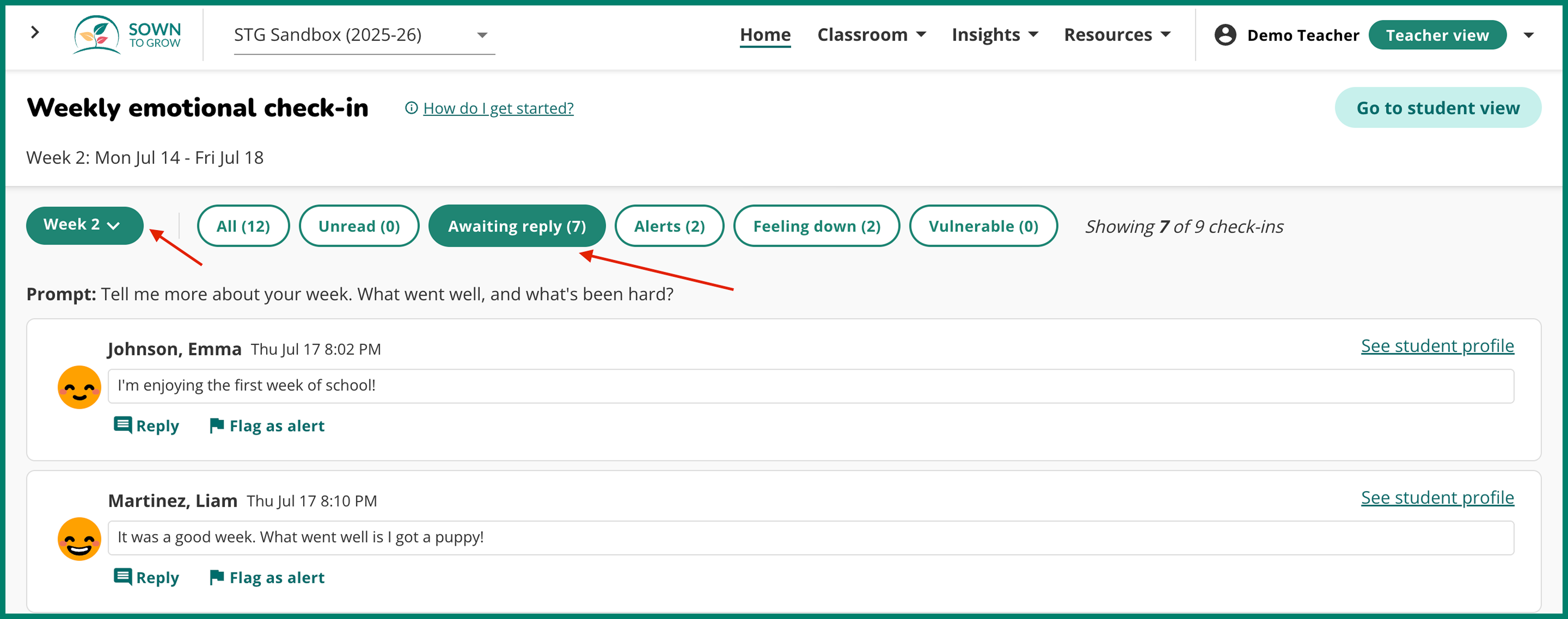 In order to respond to these check-ins, teachers must go to the "Check-Ins" page(s) and then go to the correct week. See the table above to find the check-in type and week number. Once you are in the correct week and check-in page, use the "Awaiting reply" filter to see all student check-ins for that week that have not received a teacher response.