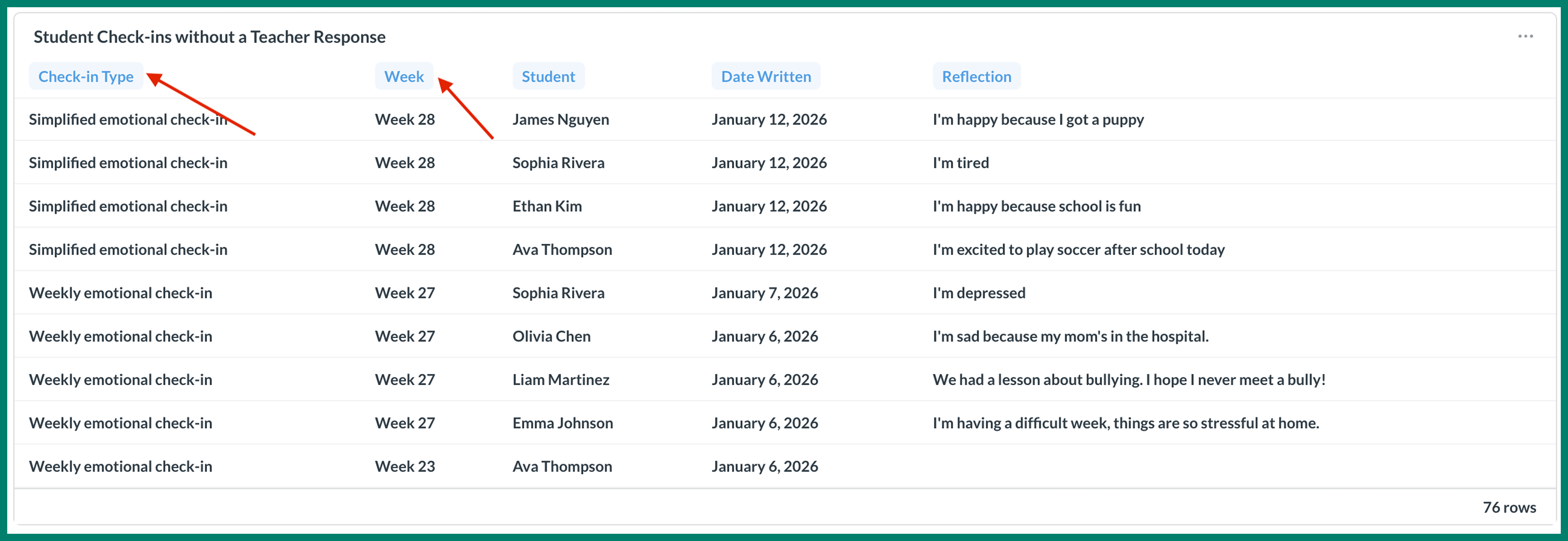 Once you're in the "Classroom insights" page, scroll down until you see the "Student Check-ins without a Teacher Response" table. For each check-in in this table, you'll see the check-in type, week number, check-in date, and student name. You'll need to know the check-in type and week to respond to a check-in.