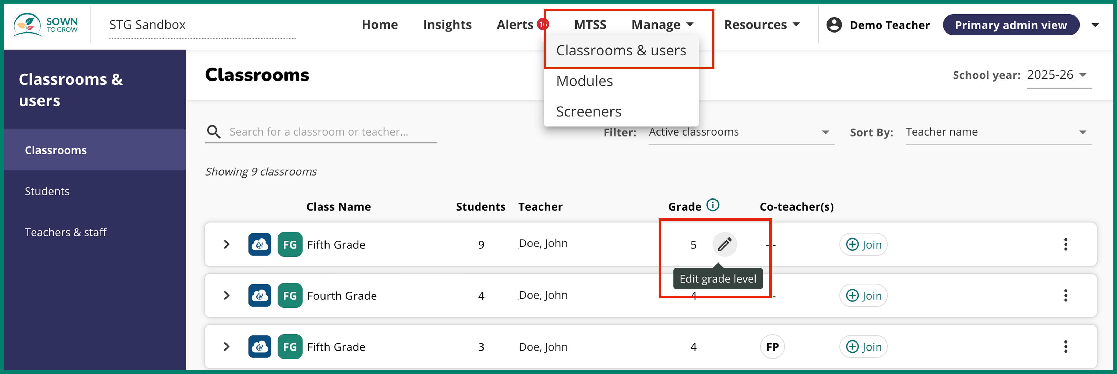 Administrators can edit classroom grade levels by clicking “Manage” → “Classrooms & users” to access the “Classrooms” page. From here, hover over any classroom’s grade and click the pencil icon to edit it. If a classroom does not have an associated grade level, hover over the empty column and click on the pencil icon to add a grade level.
