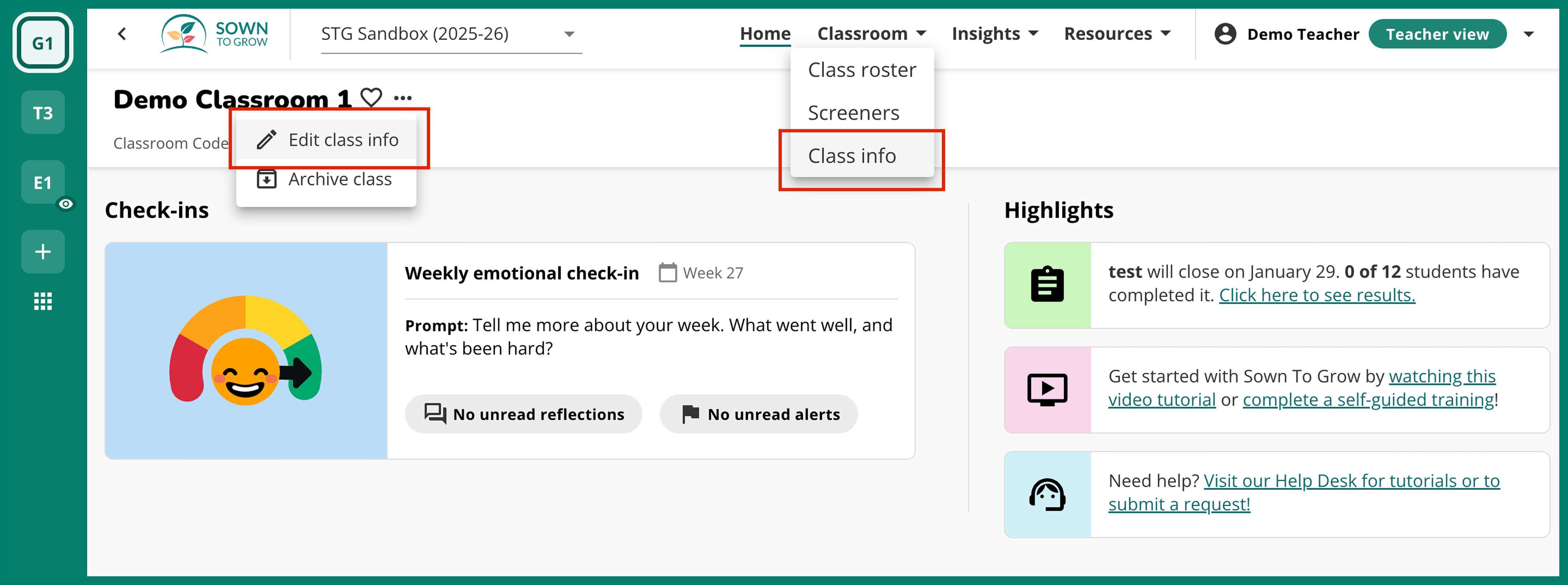 Teachers and co-teachers can edit their classroom info, including editing its grade level, in two ways: