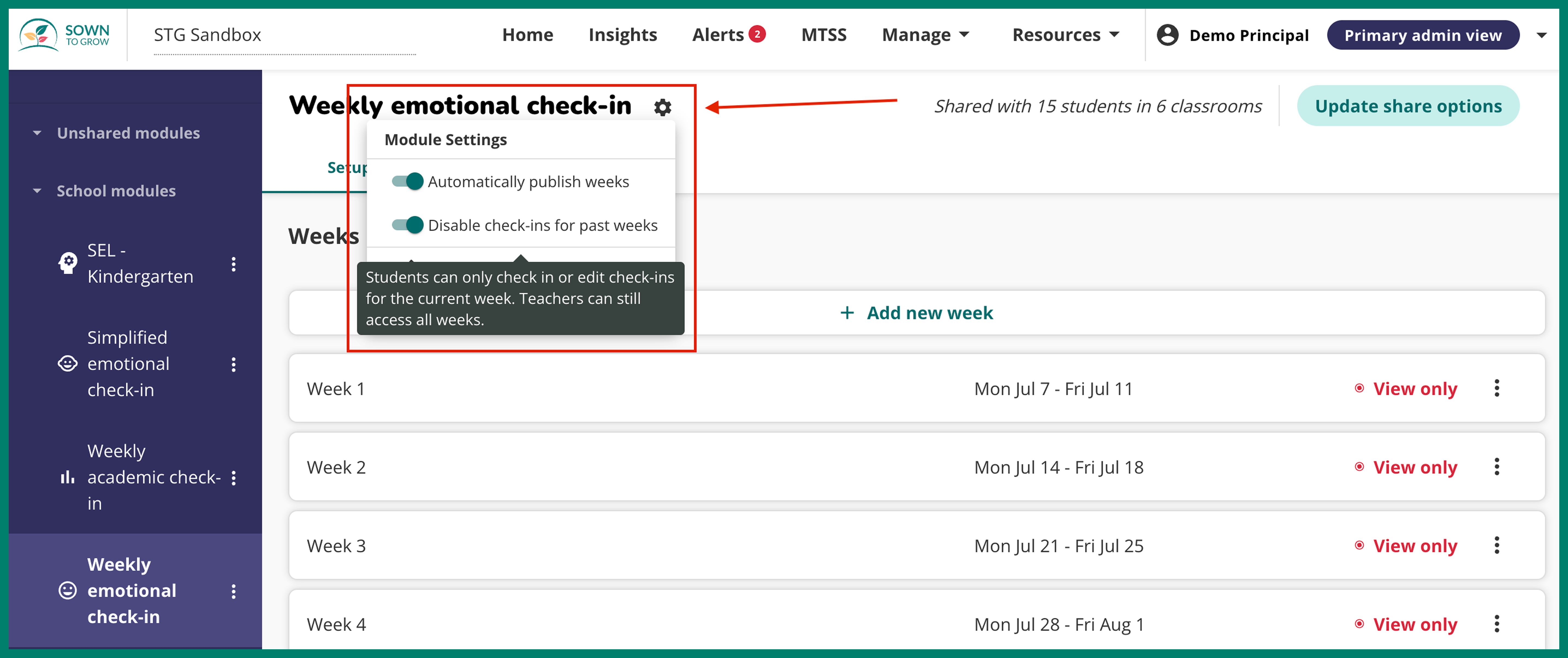 This new module setting allows school admins to limit student check-ins to only the dates of the current week. This means that students will not be able to check in or edit check-ins for past weeks or future weeks. Teachers will still be able to access all module weeks to read and respond to student reflections as usual.